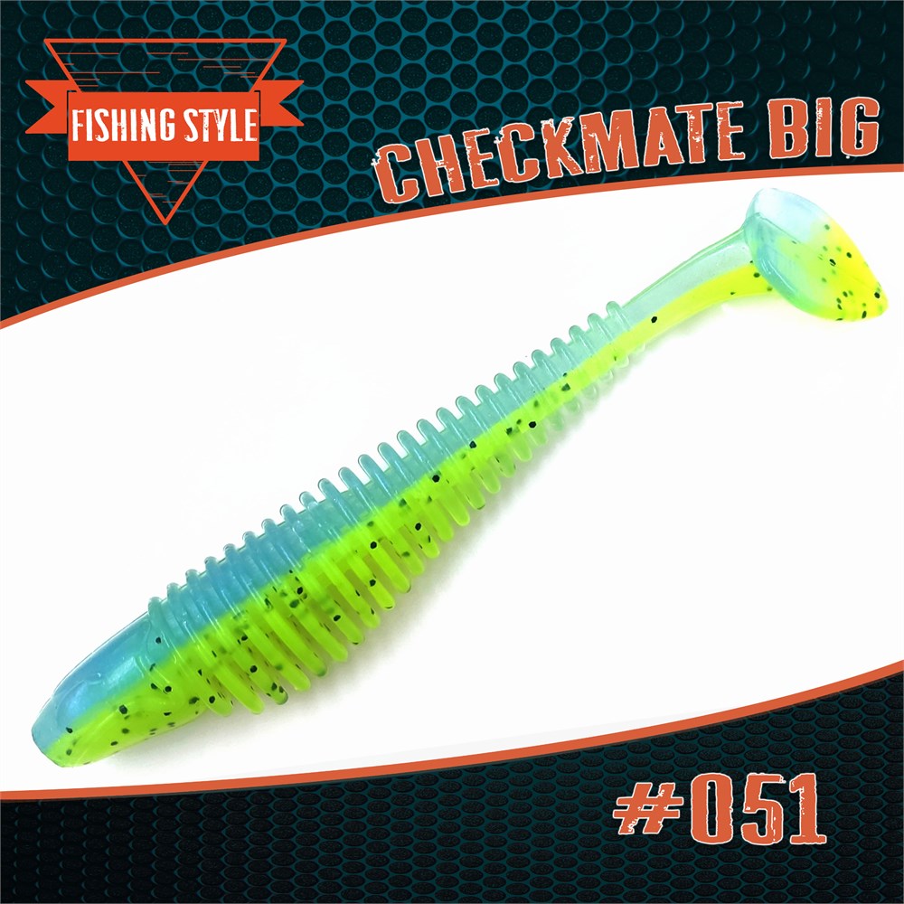 Силиконовая приманка "CHECKMATE BIG" это виброхвост с объемным телом пяткой в виде сердечка.Нижняя часть тела построена из глубоких ребер, которые постепенно уходя в хвостовую часть становясь менее глубокими.